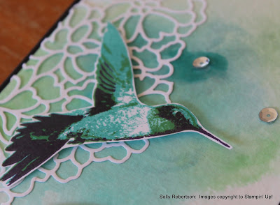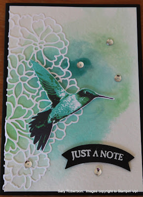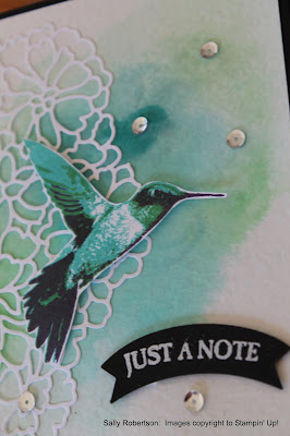To create the background we used watercolour paper, an aquapainter, spritzer and ink. I love the arty randomness of this technique! The background inks were 'Bermuda Bay' and 'Cucumber Crush' (also retiring).