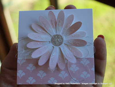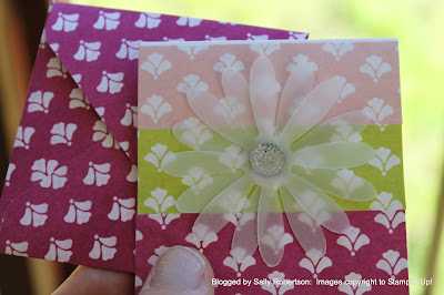 From left to right: The first daisy is stamped, then sponged and fine tipped adhesive is then used over the flower centre. The middle daisy is made using 'vellum' along with a faceted gem centre. Strips of the Floral DSP make up the background, . Envelopes are made with the envelope punch board in coordinating DSP.